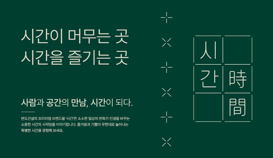반도건설이 서정적인 한국의 미(美)를 강조한 ‘시간(時間)’을 통해, 2014년 런칭한 ‘카림애비뉴’와 2021년 선보인 ‘파피에르’에 이어 세 번째 상업시설 브랜드를 출시했다. 동탄, 김포, 세종, 고덕, 내포 등 주요 신도시에서 이미 검증된 반도건설의 상업시설 노하우를 바탕으로 ‘시간(時間)’ 역시 큰 기대를 모으고 있다.