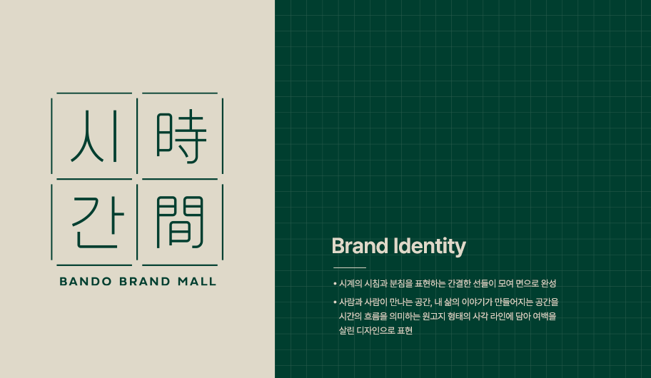 ‘시간(時間)’의 BI(Brand Identity)는 시계의 시침과 분침을 형상화한 간결한 선들이 모여 면을 이루고, 사람들이 만나 소중한 추억을 쌓는 공간을 원고지 형태의 사각 라인에 담아내 여백을 살린 디자인으로 표현했다.