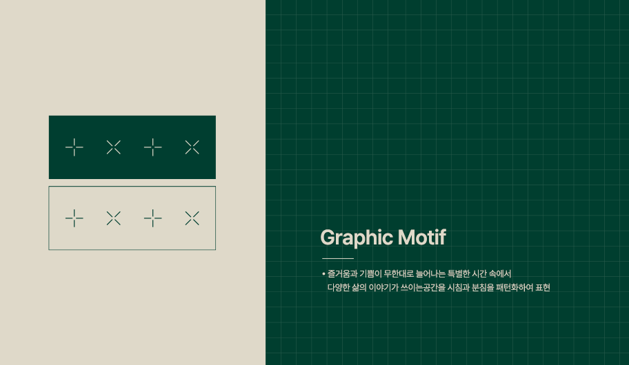 그래픽 모티브는 즐거움과 기쁨이 가득한 특별한 시간 속에서 다양한 이야기가 펼쳐지는 공간을 시침과 분침 패턴으로 나타냈다. 브랜드 컬러로는 Deep Green과 Beige를 사용해 전통 한지의 따스함과 멋스러움을 구현했다.