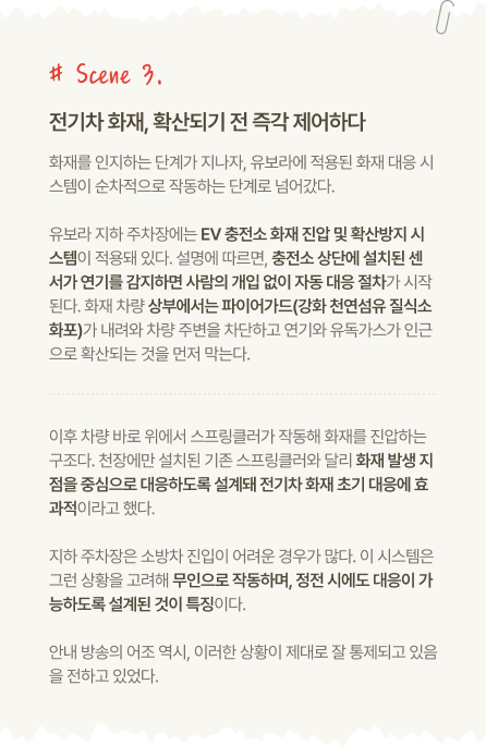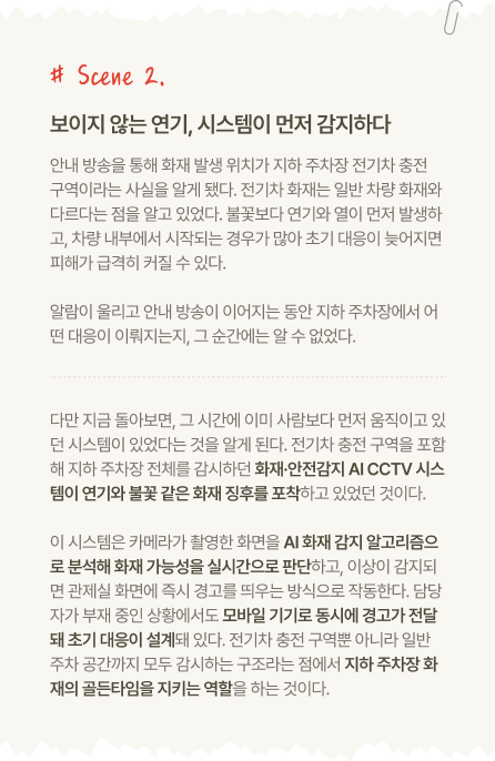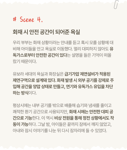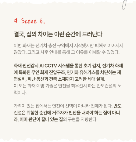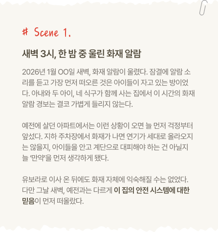 * 본 콘텐츠는 화재 상황을 가정한 가상 시나리오로, 반도건설이 개발 중이거나 연구·검토 중인 안전 기술의 작동 원리를 이해하기 위해 구성된 내용입니다. * 본문에 소개된 일부 기술 및 시스템은 현재 유보라 단지에 실제 적용되지 않았거나, 단지·시기별로 적용 여부 및 사양에 차이가 있을 수 있습니다.