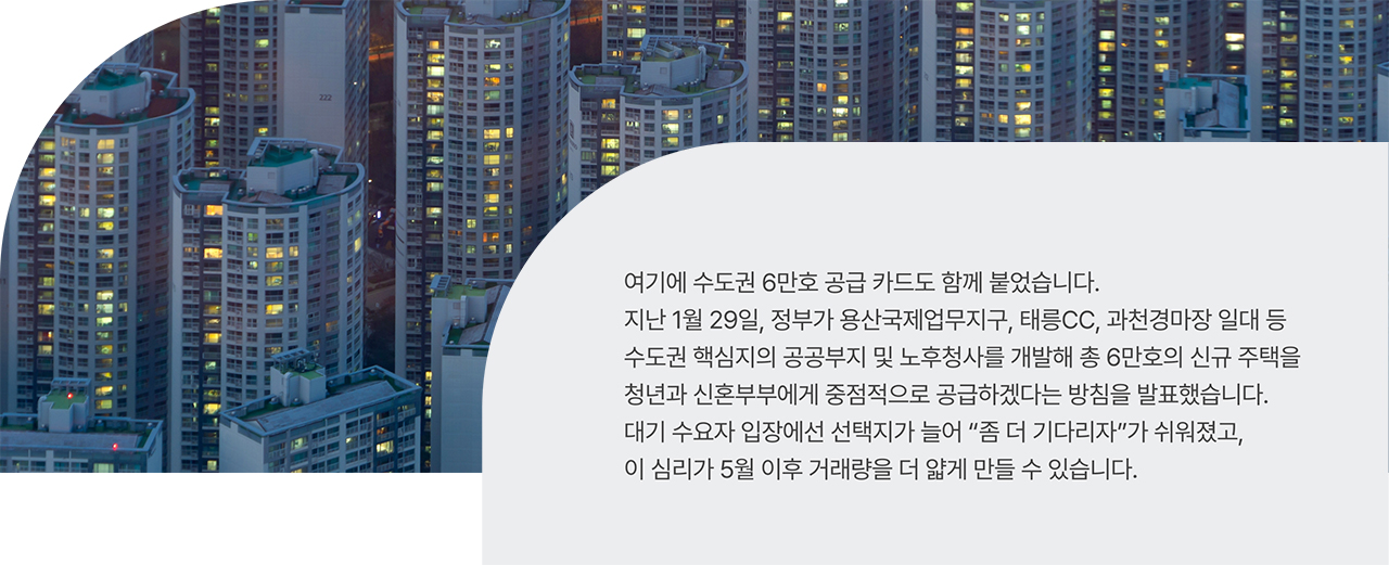 5월 이후 시장은 두 방향으로 갈 거란 전망입니다. 첫 번째는 거래 절벽입니다. 세금을 피하지 못한 다주택자들이 “차라리 안 판다”고 버티면 매물은 다시 줄고, 사려는 사람도 관망하면 거래량이 떨어집니다. 두 번째는 완만한 가격 조정입니다. 5월 전 못 판 다주택자들이 세금을 감수하고라도 팔면 매물은 계속 나오고, 사는 사람이 적으면 가격은 내려갈 수 있습니다. 어느 쪽이 될지는 5월까지 거래량이 보여줄 겁니다. 분명한 점은 5월까지가 매물을 비교해 볼 수 있는 구간이라는 점입니다.