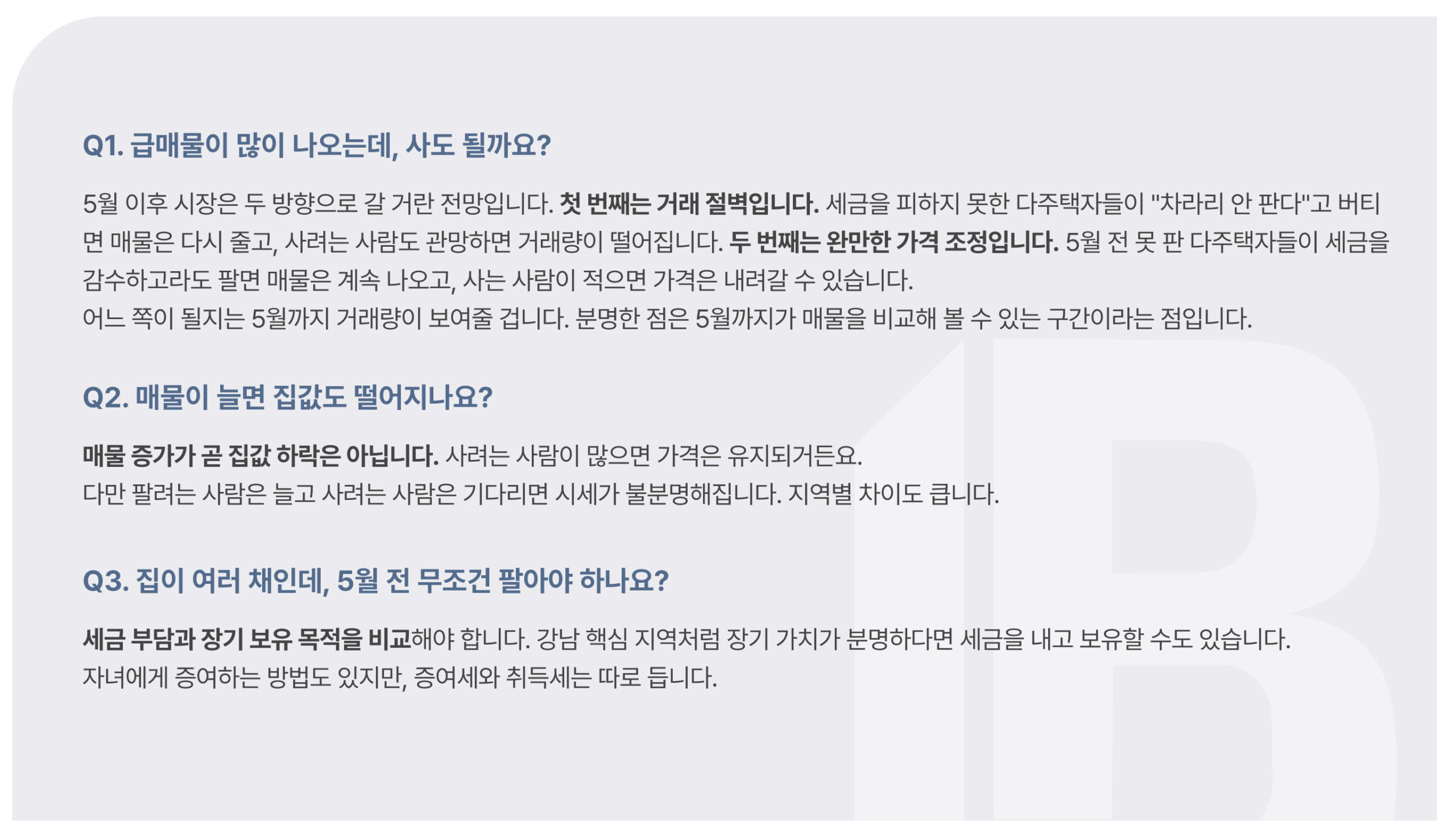 만약 보유세 증가분이 양도세 중과 부담보다 더 크게 느껴진다면, 다주택자는 세금을 감수하고서 라도 집을 팔 수 있습니다. 반대로 보유세 부담이 제한적이거나 방향이 또렷하지 않다면, “일단 버티자”는 선택이 늘 수 있습니다. 결국 매물 흐름은 양도세와 보유세 가운데 무엇이 더 아프게 다가오느냐에 따라 갈릴 가능성이 있습니다.
