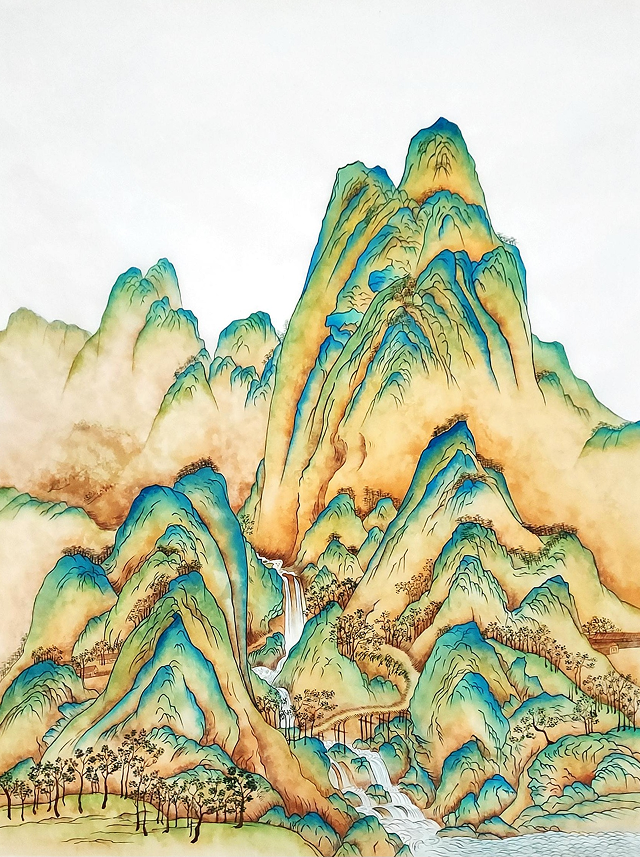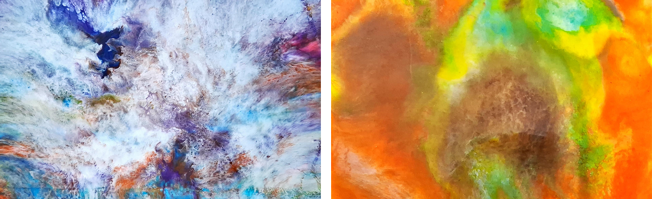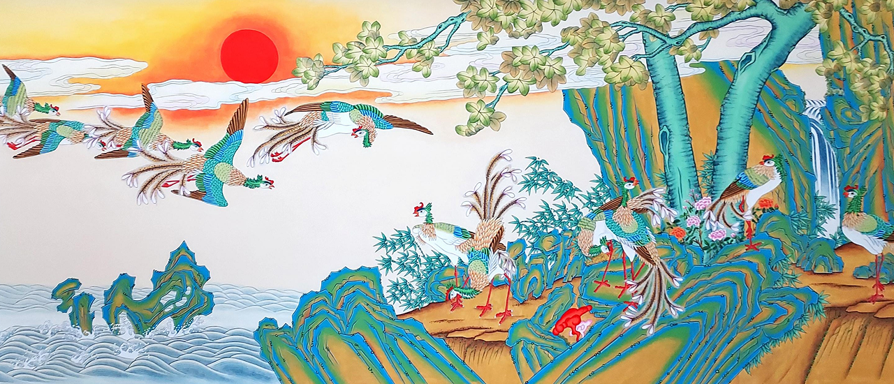 민화는 반복과 수련의 예술이다. 오랜 시간 같은 도상을 그리며 선을 익히고, 색을 쌓고, 화면의 균형을 몸에 새긴다. 반면 플루이드 아트는 통제를 내려놓는 데서 시작한다. 물감을 붓고, 기울이고, 흐르게 두면서 우연이 만들어내는 형태와 색의 조합을 화면에 담는다. 정성과 자유, 반복과 우연. 이 두 감각이 한 작가의 손에서 나온다는 것이 이번 전시의 가장 흥미로운 지점이다.