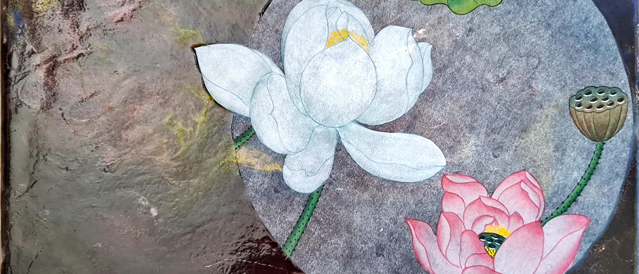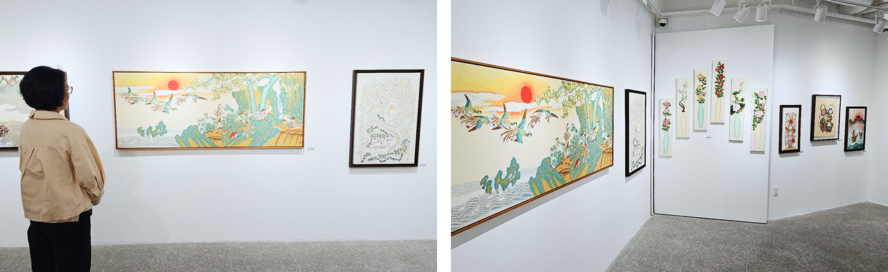 그리고 <플루이드 위로 피어난 민화>가 있다. 캔버스와 레진, 아크릴 위에 순지와 분채가 함께 쓰인 작품이다. 플루이드 아트가 만들어낸 유동적인 배경 위에 연꽃이 초현실적인 공간에 떠 있는 듯한 분위기를 연출한다. 전통 재료와 현대 재료가 한 화면 안에서 공존하는 이 작품이 전시 제목의 의미를 가장 직접적으로 담고 있다. 민화의 결과 플루이드 아트의 흐름이 실제로 만나는 장면이다.