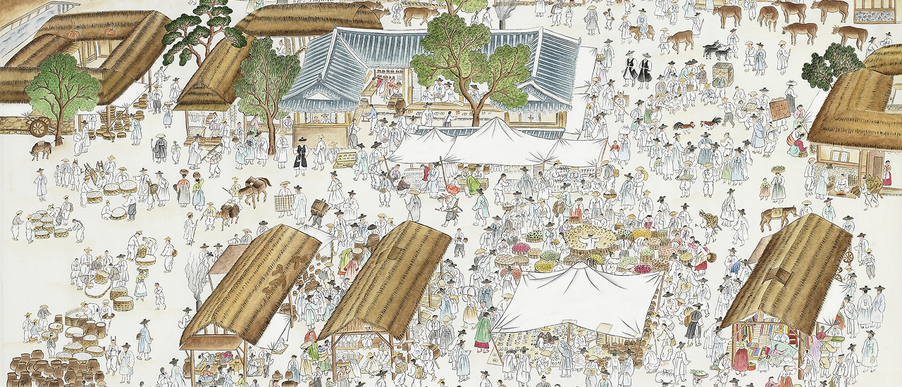 <장터(풍속도)>는 이번 전시에서 분위기가 가장 다르다. 가로 123cm의 넓은 화면에 옛 장터의 풍경이 가득하다. 보부상과 장돌뱅이, 주막과 국밥집, 엿장수와 쌀장수까지. 서민들의 활기찬 일상이 세밀하게 그려져 있다. 고귀함이나 기원을 담은 다른 작품들과 달리, 이 그림은 그저 사람 사는 모습을 본다.