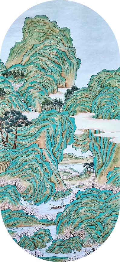 <도원 행주도>는 복숭아꽃이 피는 낙원을 향해 배를 타고 가는 설화를 담은 작품이다. 꿈같은 낙원을 향한 갈망이라는 주제를 순지 위에 낭만적으로 풀어냈다.