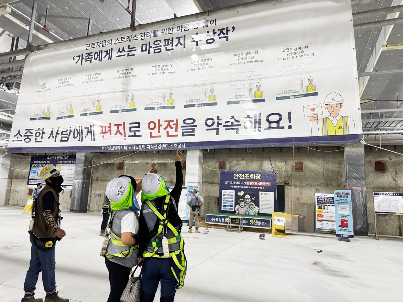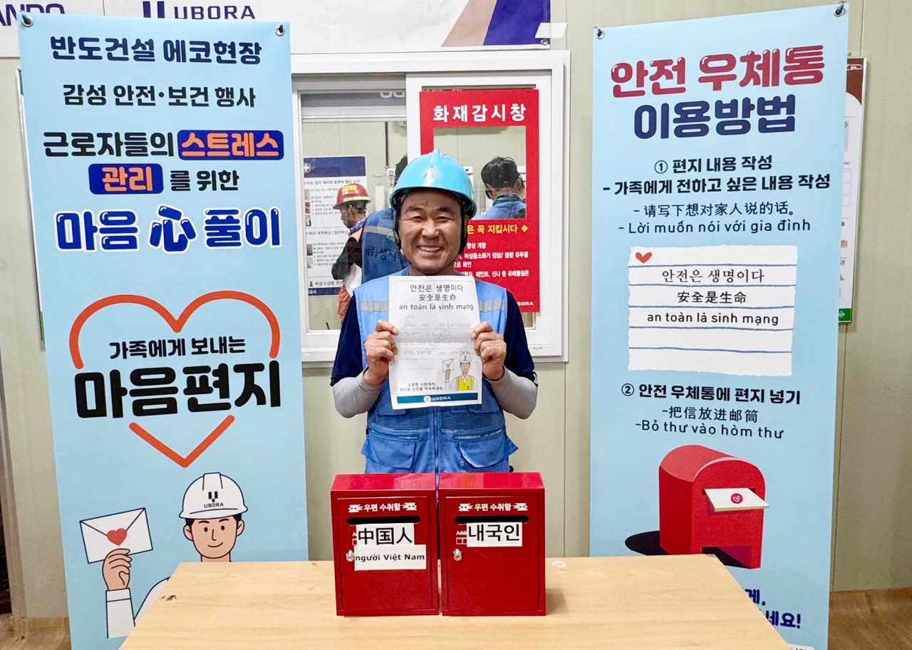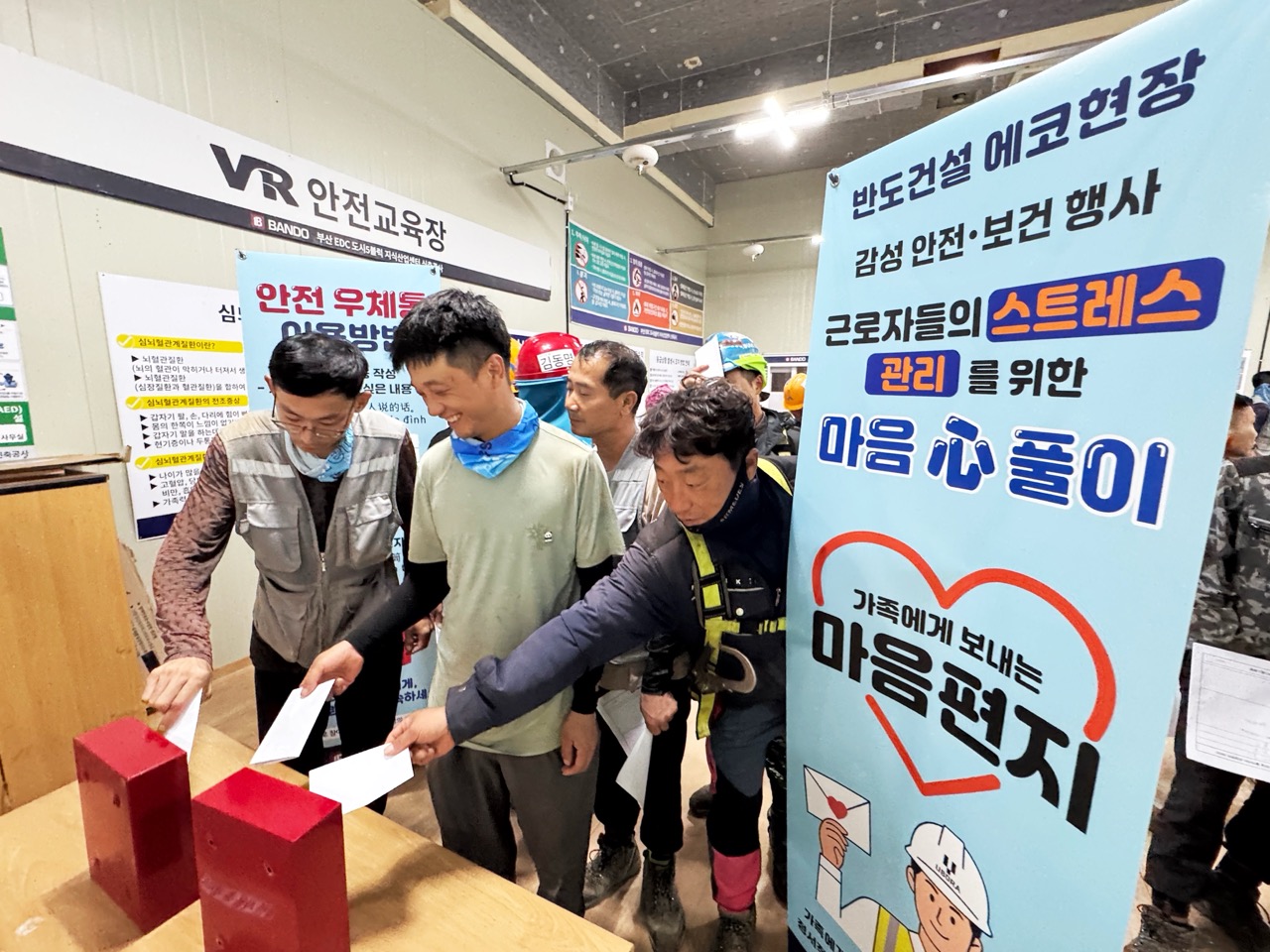 반도건설은 중대재해 예방을 위해 안전에 대한 지속적인 관심과 실천 강화를 위해 제도적 관리와 함께 안전을 생활 속 습관으로 만들기 위한 감성안전 캠페인도 함께 시행하고 있다. 부산 에코델타시티 현장에서 진행된 ‘안전 우체통 캠페인’은 이러한 감성안전 캠페인의 일환으로 현장 근로자들이 가족에게 보내는 마음편지를 통해 스스로 안전을 다짐하는 색다른 안전 프로그램으로 진행됐다.