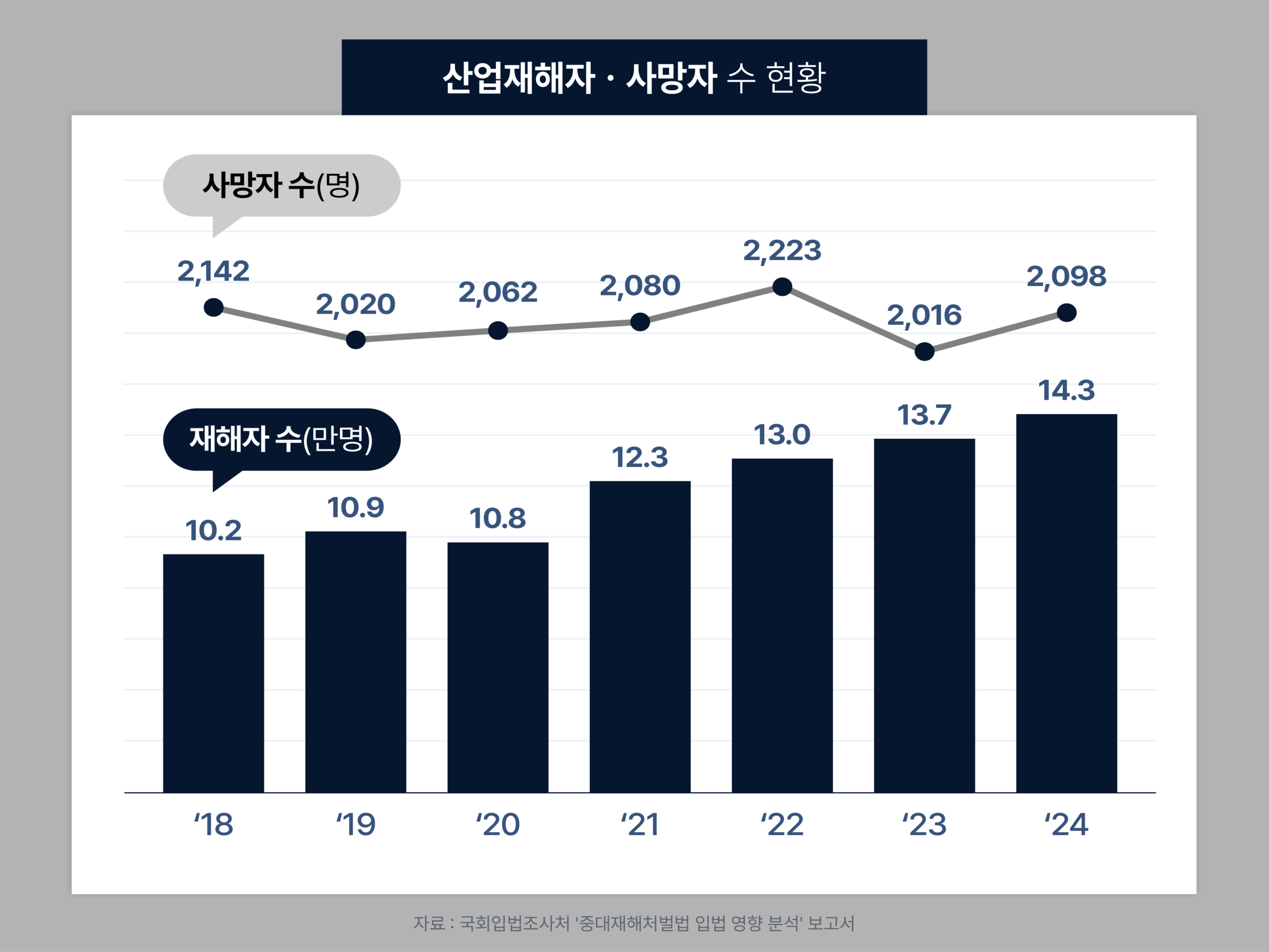 중대재해처벌법 시행 이후 산업재해자 수와 사망자는 오히려 늘어나면서 중대재해에 대한 사회적 관심이 높아지고 있다. 고용노동부 중대재해 알림e에 따르면, 2025년 상반기 산업재해 사망자는 총 287명으로 집계되었으며, 이 가운데 건설업 종사자는 절반에 해당하는 138명으로 건설현장 안전에 대한 경각심과 노력이 더욱 필요한 상황이다.