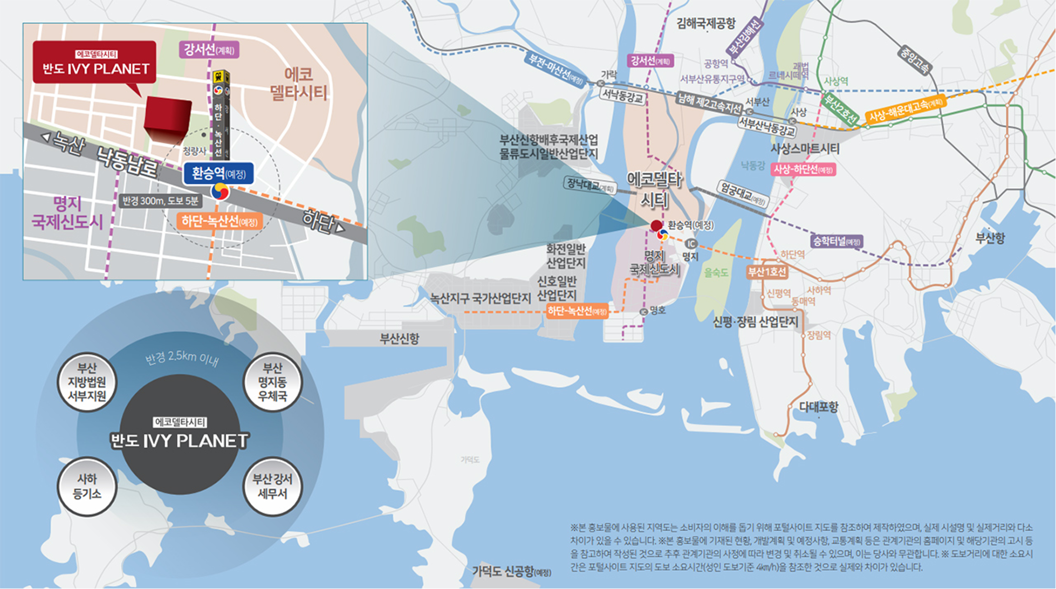 ‘에코델타시티 반도아이비플래닛’ 단지 내 상업시설은 명지국제신도시와 낙동남로에 인접한 위치로 도보 5분 거리에 강서선(계획)과 하단~녹산선(예정) 환승역이 들어서는 더블역세권 입지를 갖추고 있다. 또한 명지IC, 서부산IC가 인근에 위치해 주변 지역과의 교통망도 우수하다.