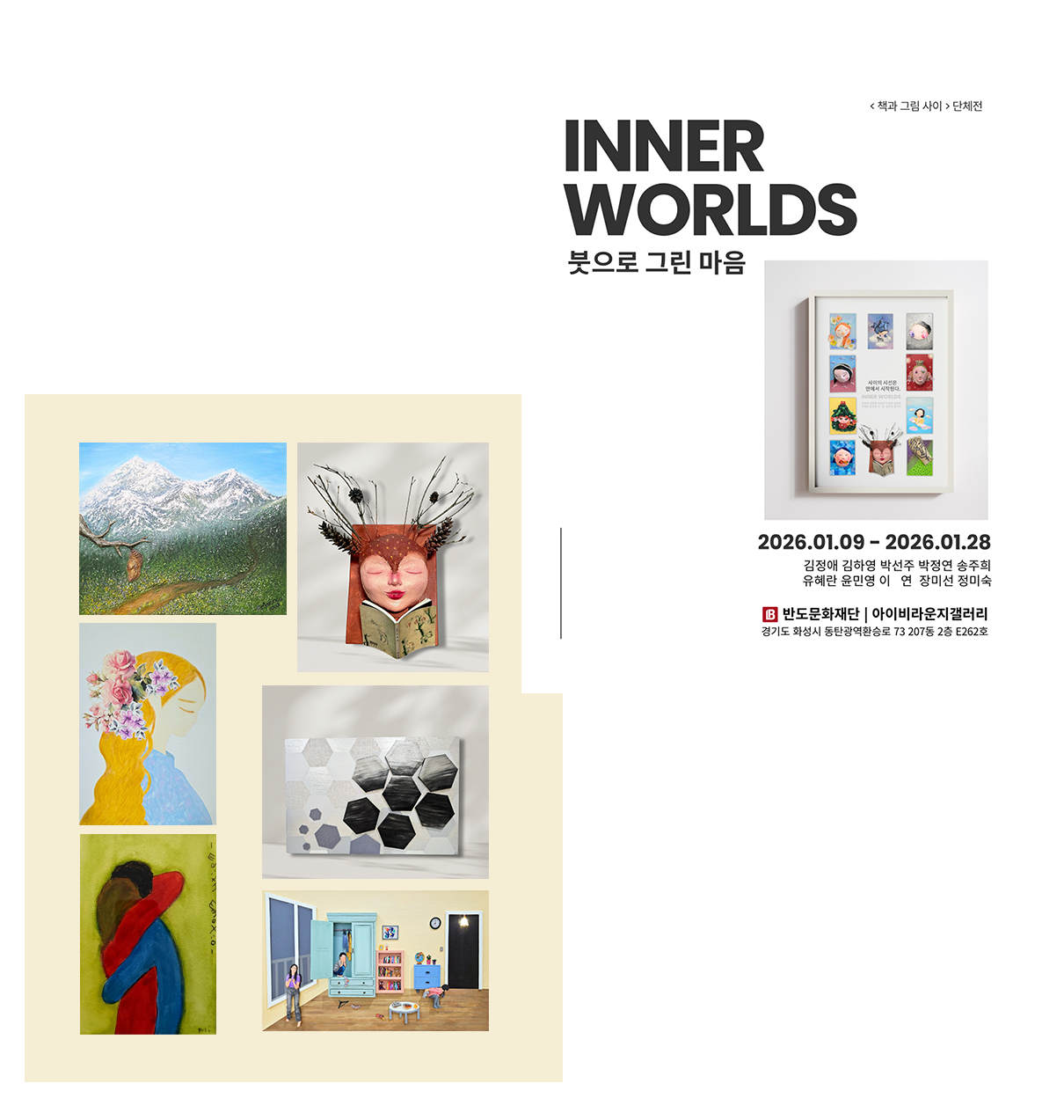 현재 갤러리에서는 지역 미술 커뮤니티 ‘책과 그림 사이’에서 활동 중인 작가들이 참여한 단체전 <INNER WORLDS, 붓으로 그린 마음>이 진행 중이다. 동탄 지역에서 활동해온 작가들의 작업을 한자리에 소개하며, 창작자와 관람객이 자연스럽게 만나는 전시로 구성했다.