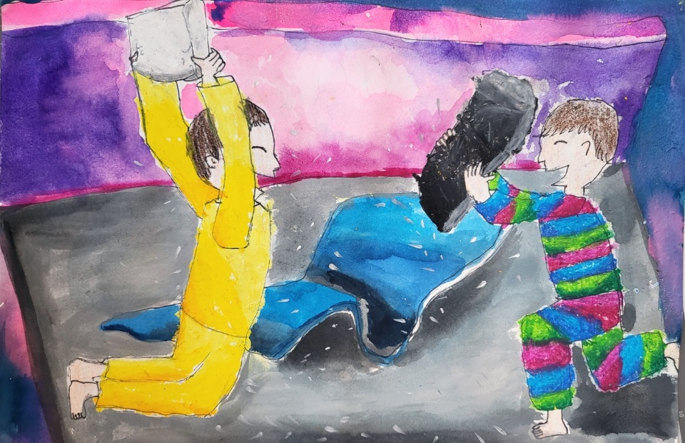 최우수상을 수상한 김이룸 어린이의 ‘베개 싸움은 즐거워’는 동생과 함께 자주 하는 베개 싸움의 즐거움을 순수한 동심으로 표현했다. 그림을 그린 김이룸 어린이는 ‘엄마가 먼지 때문에 하지 말라고 하지만 베개 싸움이 너무 재미있어서 이 그림을 그리게 됐다’고 한다. ‘동생이랑 함께하는 시간이 너무 즐겁고 자주 싸우지만 동생을 사랑한다’는 애정 가득한 마음이 엿보이는 작품이다.