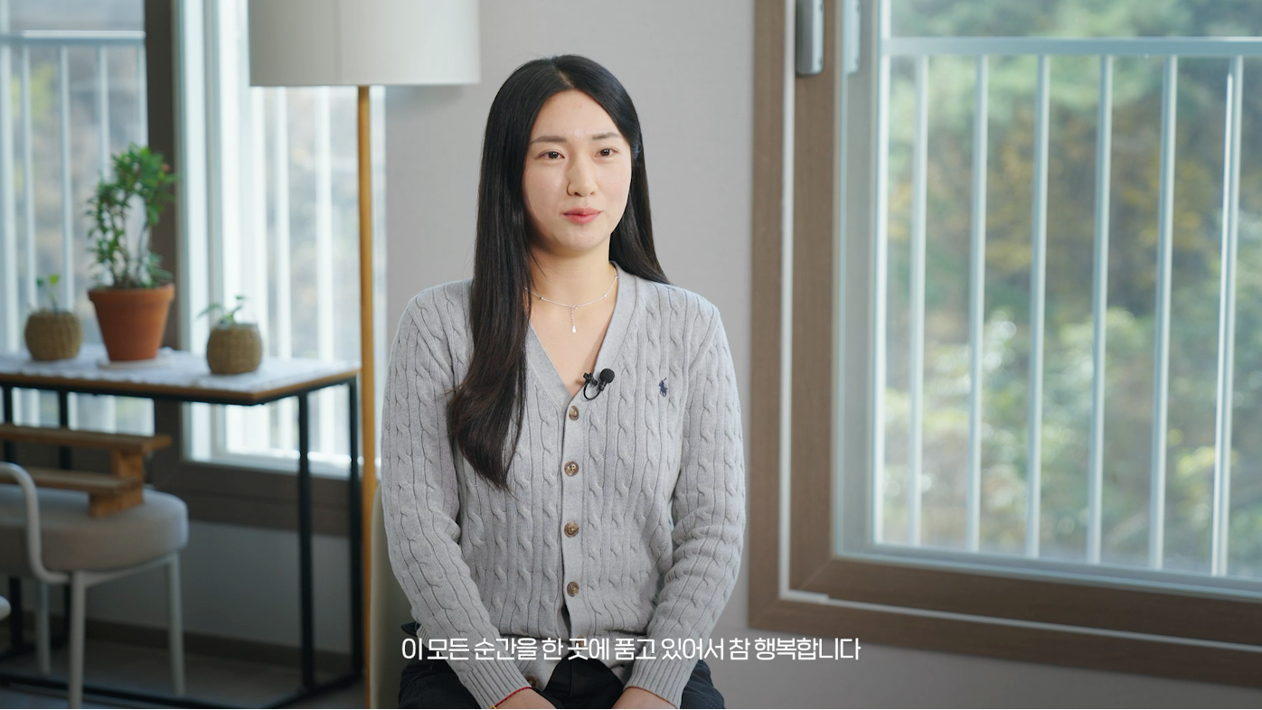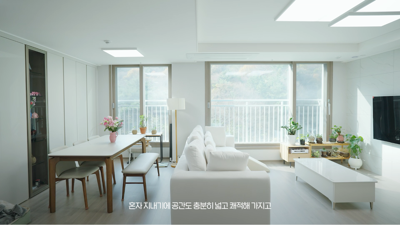 남향 구조로 설계된 공간에는 햇살이 깊숙이 들어와 하루 종일 밝고 기분 좋은 생활이 가능하다. 송이는 창가에 앉아 들어오는 햇빛을 느끼며 잠시 햇볕을 즐기고, 지인씨는 그런 모습을 바라보며 하루를 시작한다.
