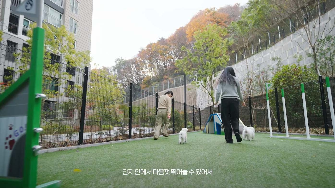 산책로를 따라 걷다 보면 단지 내 펫파크에 도착한다. 산책로와 자연스럽게 이어진 이 공간은 반려견을 위해 설계된 또 하나의 놀이터다. 송이는 목줄을 풀자마자 넓은 공간을 가로지르며 마음껏 달린다.