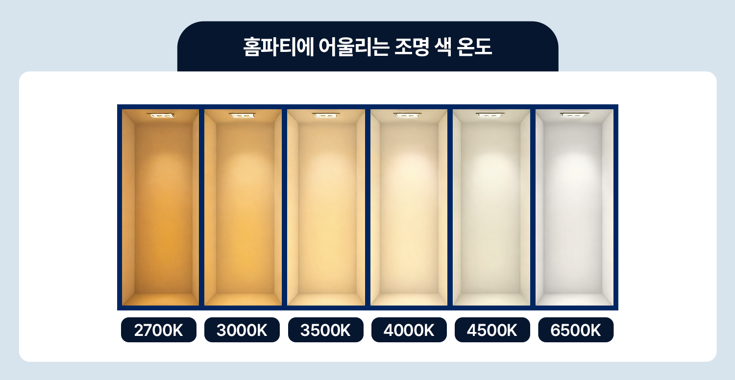 2700K~3000K 정도의 전구색은 아늑하고 편안한 분위기를 연출하기에 가장 적합하다. 홈파티처럼 감성적인 무드를 살리고 싶을 때 식탁 조명이나 거실 간접조명으로 활용하면 좋다. 3500K에서 4000K 사이의 주백색은 자연광에 가까운 색감으로, 깔끔하고 정돈된 느낌을 준다. 대화를 많이 나누는 다이닝룸이나 거실 공간에 무난하게 어울린다. 6500K의 주광색은 푸른빛이 도는 밝은 색온도로, 공간을 선명하고 넓어 보이게 한다. 다만 차가운 인상을 줄 수 있어 홈파티 공간에서는 간접적으로 사용하는 것이 좋다.