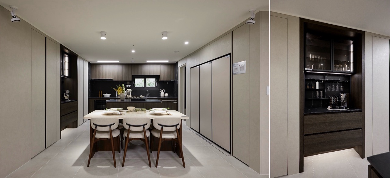 부산 동래 반도유보라의 아일랜드 키친 형식의 홈바 & 대면형 주방과 같은 공간은 음식이나 음료를 셀프로 즐기기에도 효율적이며, 파티를 좀 더 자유롭고 캐주얼하게 만들어준다. 특히 동선이 유연해져 공간이 협소해도 자연스러운 흐름을 유지할 수 있다.