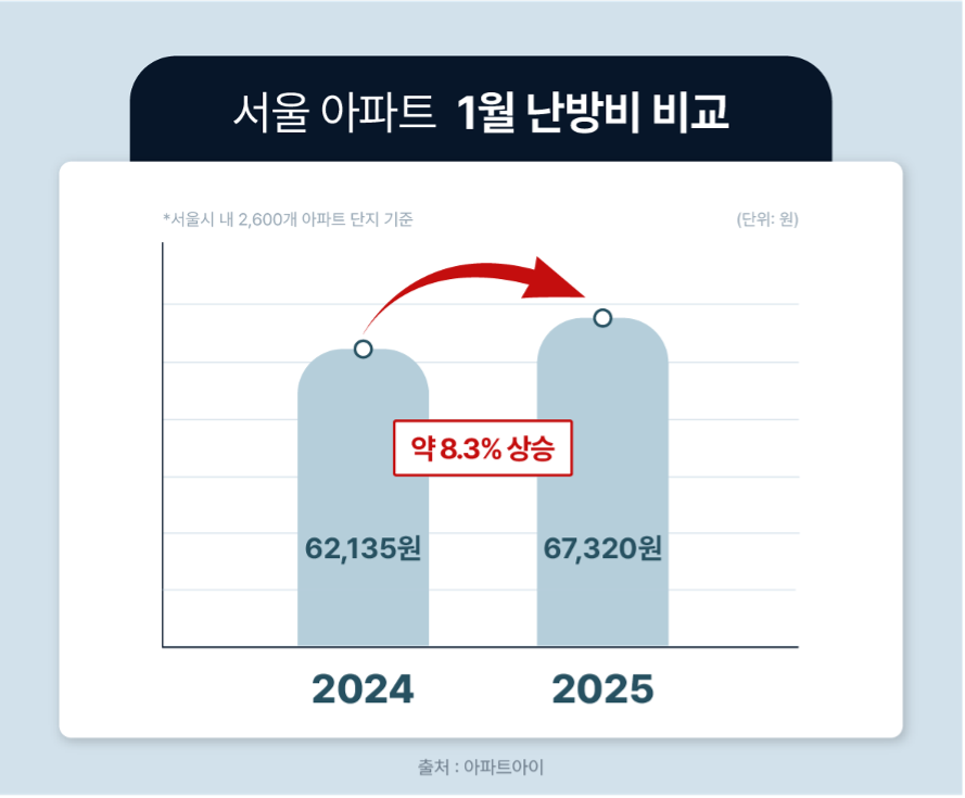 실제로 아파트 생활 지원 플랫폼 ‘아파트아이’에서 서울시 내 2,600개 아파트 단지의 1월 난방비를 분석한 결과, 전용 85㎡ 아파트 기준으로 전년 동기 대비 평균 약 8.3%가량 상승한 것으로 나타났다. 이는 겨울철 난방비에 대한 부담이 여전히 적지 않다는 점을 보여주는 지표다.