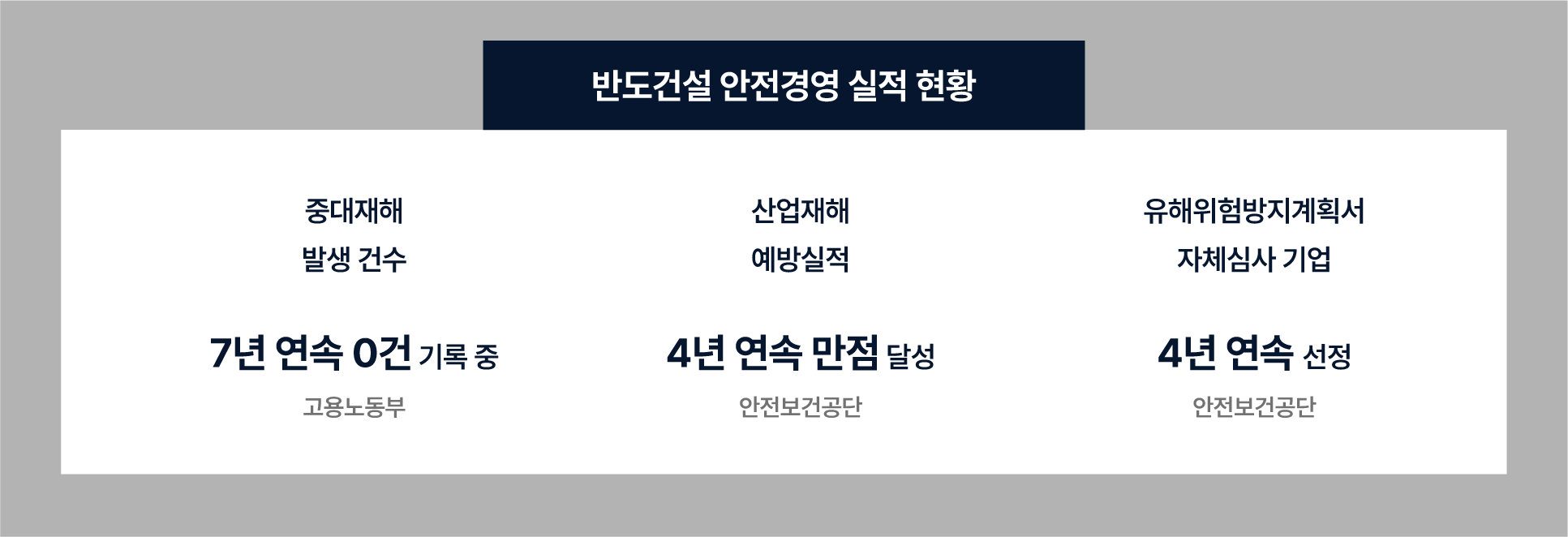 실제로 반도건설은 최근 7년간 중대재해를 단 한 건도 발생시키지 않았으며, 산업재해 예방 실적에서도 4년 연속 만점(100점)을 기록하고 있다. 유해위험방지계획서 자체심사 기업으로도 4년 연속 선정되는 등 제도적 인증에서도 지속적인 우수성을 보여주고 있다.