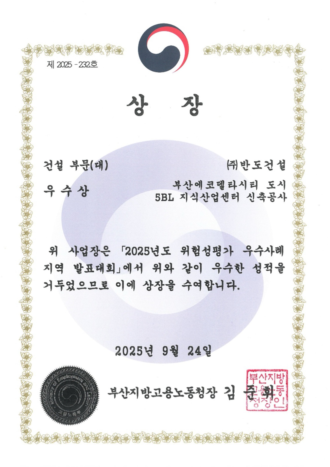 이와 같은 치열한 평가 과정을 거쳐 반도건설이 시공 중인 ‘부산 에코델타시티 반도 아이비플래닛 지식산업센터’ 현장은 2025년 9월 24일, 건설업 대기업 부문에서 우수상(지방청장상)을 수상하는 성과를 거두었다. 이 수상은 반도건설이 자체적으로 구축한 ‘공사프로세스 연계형 위험성평가 모델’이 현장에 정착되어 체계적으로 운영되고 있다는 점에서 의미가 크다.