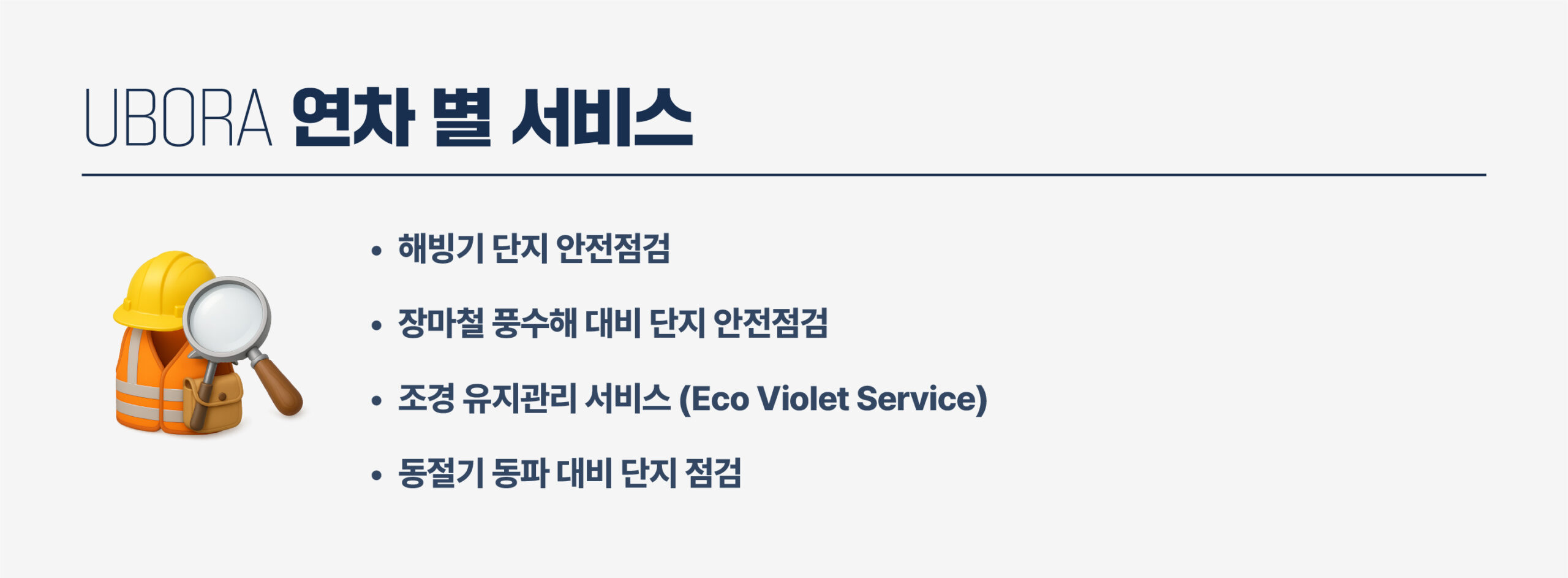입주 이후에도 유보라는 각 계절별로 발생할 수 있는 위험 요소를 사전에 점검하고 예방하는 정기적인 연차 별 관리 프로그램을 시행하고 있다. 대표적인 예로는 해빙기 균열점검, 장마철 배수관리 및 안전점검, 동절기 열선 점검 및 동파 예방활동 등이 있으며, 단지에 따라 고사목 교체나 잔디 보수 등 조경 유지 관리 서비스도 병행된다.