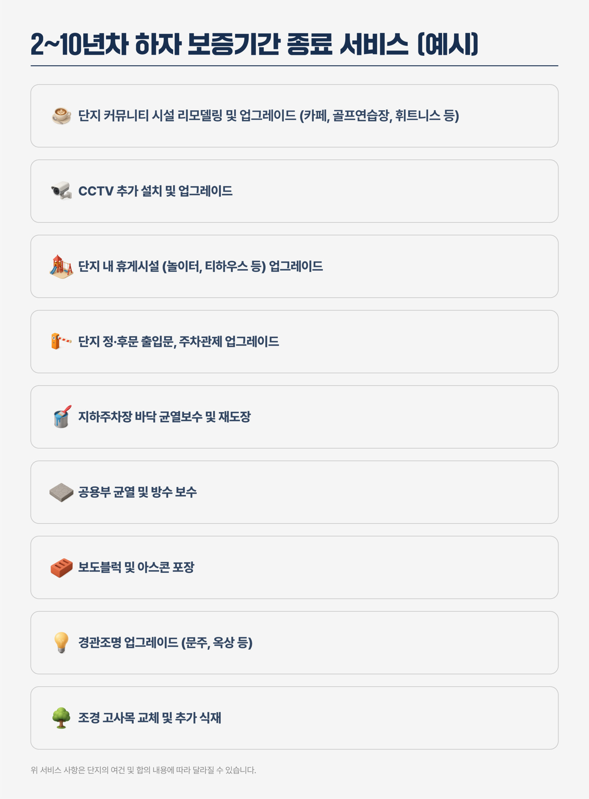 연차합의 시 제공되는 서비스는 단순히 하자보수에 그치지 않는다. 단지 여건과 입주민의 합의에 따라 다양한 공간이 실제로 업그레이드되고 있다. 이러한 서비스는 실제 입주민이 매일 이용하는 공간에서 직접적인 변화를 체감할 수 있어, 입주민 만족도와 단지 자산가치에 긍정적인 영향을 미친다.