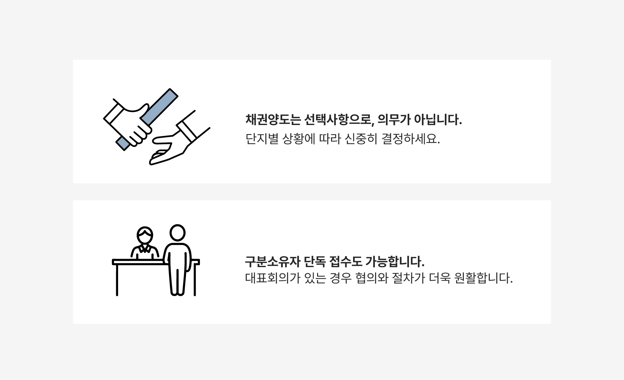 그리고 하자보수를 받기 위해 반드시 채권양도를 해야 하는 것은 아니다. 구분소유자 단독 접수도 가능하지만, 대표회의가 있는 경우 협의가 수월하며, 공동 대응 시 효율성이 높다. 또한 이미 채권양도를 한 후 소송이 진행된 경우에도 상황에 따라 소송 취소가 불가능할 수 있다. 따라서 채권양도나 소송 개시 전에는 충분한 설명을 듣고 단지 구성원과 함께 신중하게 판단하는 것이 중요하다. 마지막으로 법무법인과 계약을 체결할 경우, 수임료 외에도 각종 제반 비용이 따를 수 있으며 이에 대한 계약서 내 명시가 필요하다. 이 부분이 명확하지 않으면, 소송 최종 판결 이후 배상액에 대한 기대와 실수령액이 달라 혼선이 생길 수 있다.