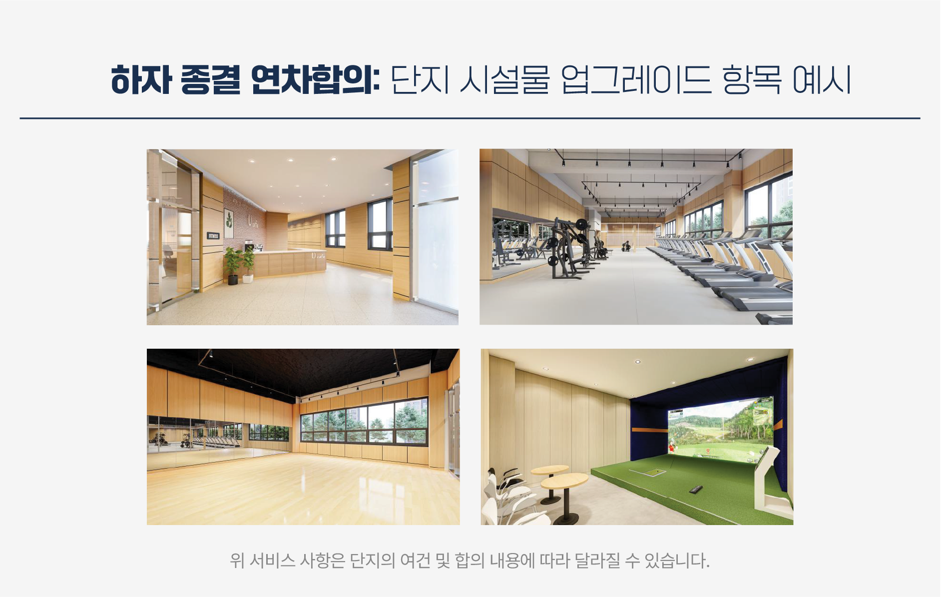 하자보수는 단순한 복구가 아니라 단지의 자산 가치를 유지하고 높이는 과정이다. 연차합의는 하자보수와 함께 단지의 숙원 사항까지 통합적으로 개선할 수 있는 기회를 제공한다. 커뮤니티 시설 업그레이드, 조경·조명 개선, 주차관제 시스템 교체 등 노후 시설의 개선 작업을 시공사와 함께 협의해 진행할 수 있어 입주민 만족도 또한 높다. 단지의 품질, 이미지, 입주민의 삶의 질까지 고려하는 차별화된 관리 방식이라 할 수 있다.