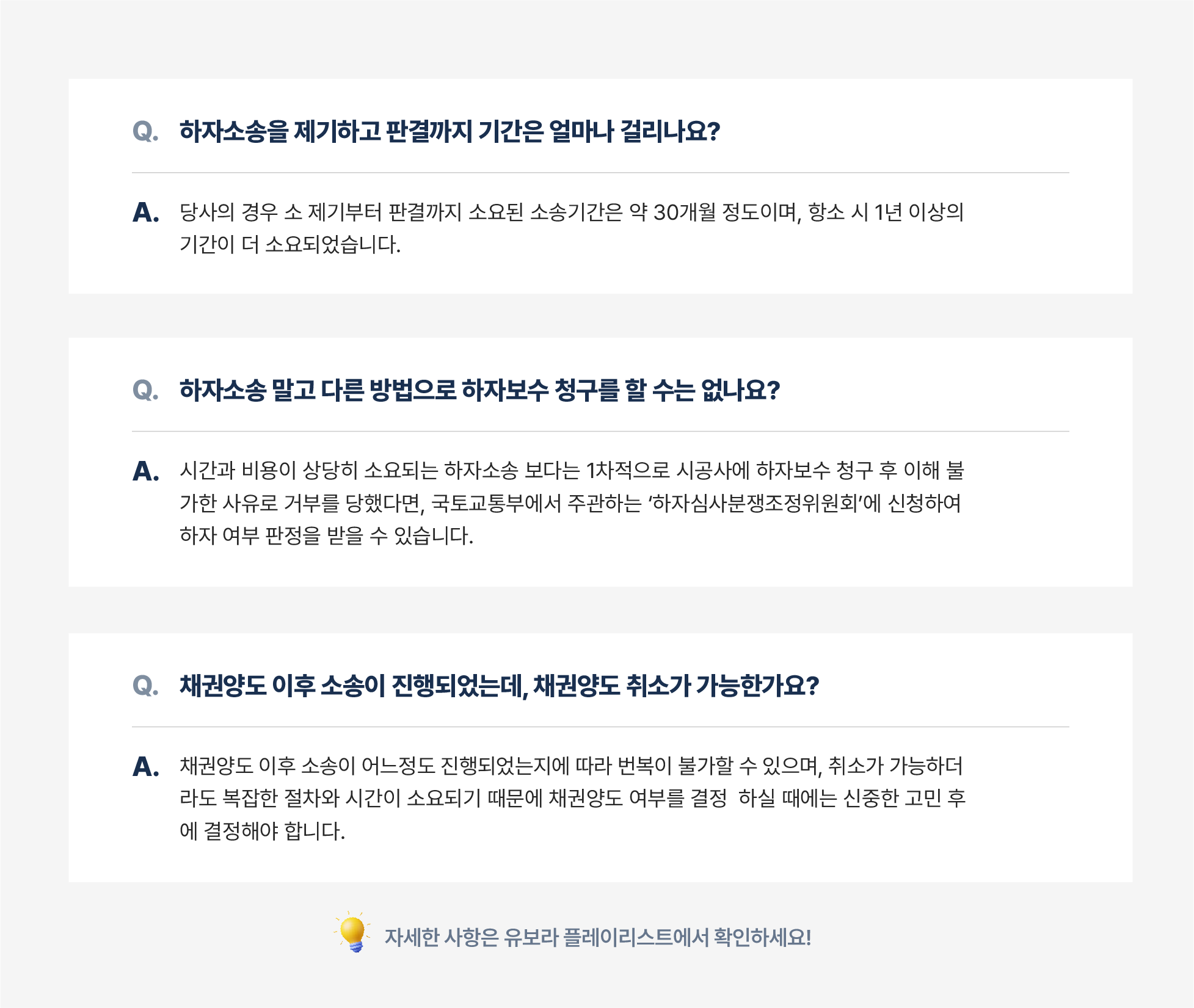 연차합의는 단지의 하자 문제를 실질적으로 해결하면서도, 입주민의 시간과 비용을 아끼고 공동체의 만족도를 높이는 가장 합리적인 대응 방식이다. 시간적, 비용적으로 소모적인 분쟁보다 실질적인 해결에 집중하고, 단기적인 감정보다 장기적인 가치를 추구하는 접근이 결국 단지를 더 건강하게 만든다. 하자보수는 단지의 품질을 지키는 첫걸음이자, 입주 후 삶의 만족도를 결정짓는 중요한 선택이다. 시공사와의 협의부터 접수, 보수 일정, 자주 묻는 질문까지, 하자보수의 모든 과정을 하나로 정리한 ‘유보라 플레이리스트’에서 더 자세한 내용을 확인할 수 있다.