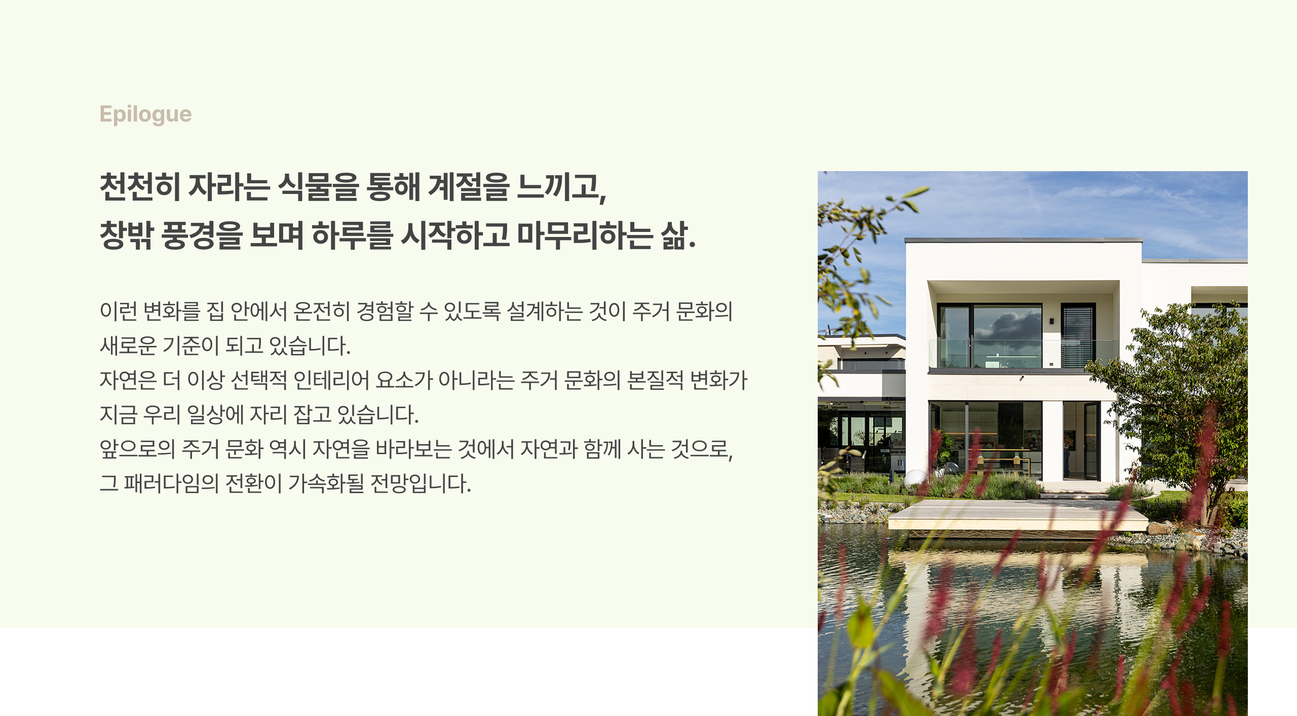 이 모든 변화는 하나의 방향을 가리킵니다. ‘자연을 바라보는 집’에서 ‘자연과 사는 집’으로의 전환. 집이 단순히 먹고 자는 공간을 넘어 심신을 회복하는 장소, 일상의 피로를 풀고 에너지를 재충전하는 환경으로 재정의되고 있다는 것입니다.