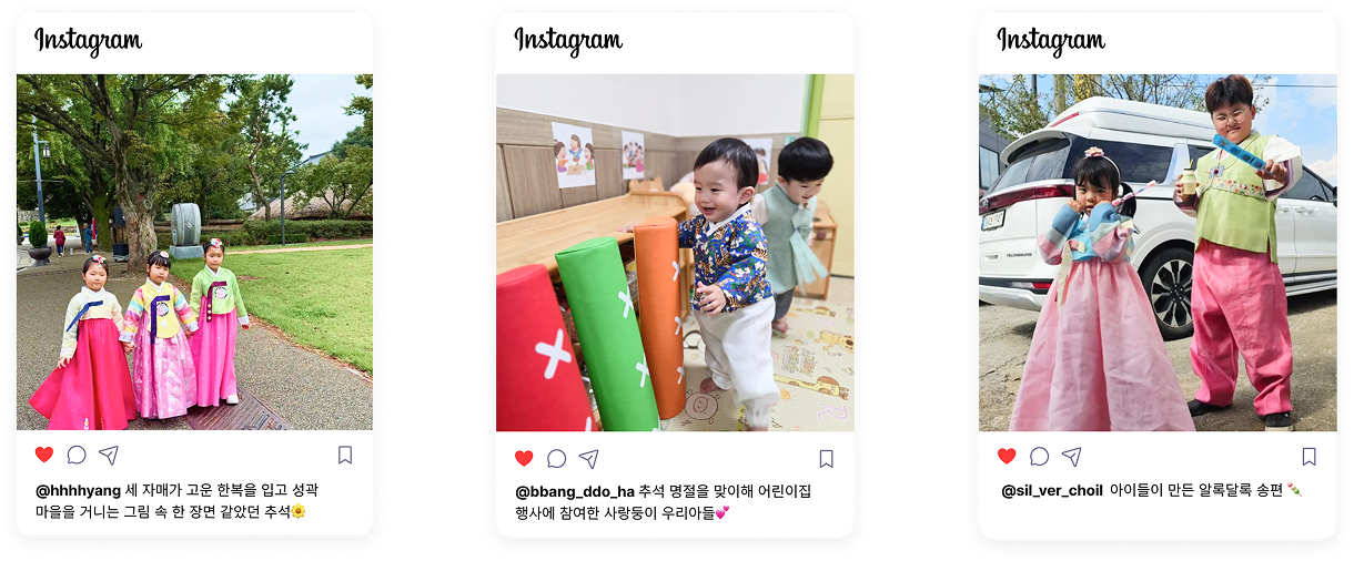 고운 한복을 곱게 차려 입은 아이들의 모습은 그 자체로 한가위의 풍경이다. 세 자매가 나란히 손을 잡고 성곽 마을을 거니는 장면은 마치 옛 그림 속 한 폭의 풍경처럼 따뜻하고 정겹다. 추석 명절을 맞아 어린이집 행사에 참여한 아이들의 환한 웃음 또한 사랑스럽다. 두 아이들의 엄마인 @bbang_ddo_ha 님은 아이들이 어려서 할머니, 할아버지를 뵙지 못한 안타까움과 함께 내년에는 더 즐거운 명절을 보내자는 약속의 메시지를 남겼다. 형제자매가 함께 한복을 입고 나란히 선 모습은 한가위의 정겨운 풍경을 완성한다.