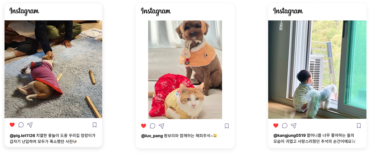 ‘가족의 일원’인 반려동물도 당당한 가족으로 즐거운 추석을 만드는데 일조했다. 윷놀이를 함께 하는 캉캉이부터 명절 한복을 입은 팡보리까지 가족의 일원으로 함께한 반려동물들이 추석의 따뜻함을 한층 더 빛냈다. @kangjung0519님의 사진과 사연은 아이와 강아지가 나란히 할머니를 기다리는 모습에서 세대와 종(種)을 넘어서 ‘함께한다는 것’의 의미를 다시 생각하게 해 주었다.