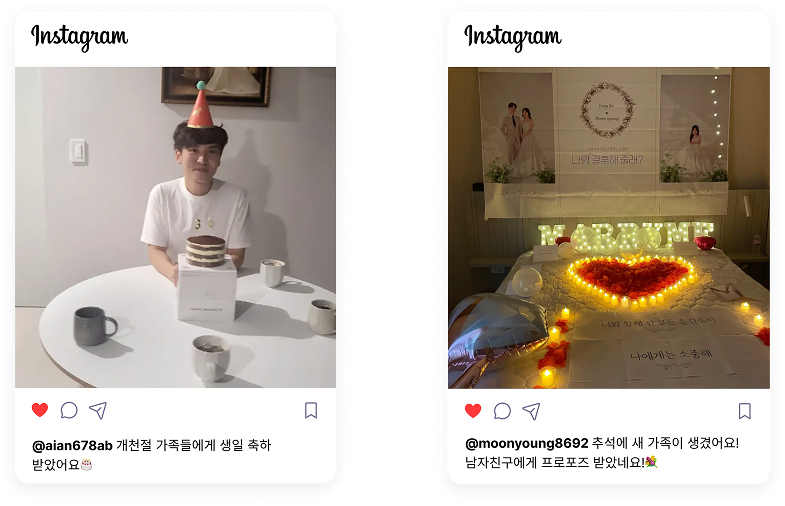 “추석에 새 가족이 생겼어요!” 누군가에게 명절은 가족의 날이자, 또 다른 기념일이 되기도 한다. 프로포즈를 받은@moonyoung8692님의 사연처럼 올해 추석은 누군가에게 사랑의 시작이 되기도 했다. 행복감과 함께 새로운 가족을 만드는 기대감이 섞여 가족의 소중함을 더욱 느끼게 되는 추석의 의미를 더욱 잘 느끼게 해줬다.
