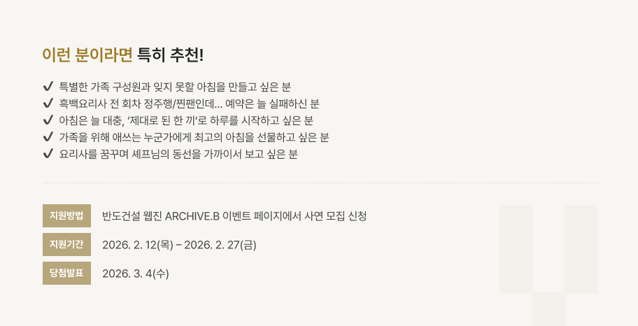 유보라 TV가 셰프님의 아침상을 우리집 식탁에서 직접 맛볼 주인공을 찾습니다.넷플릭스 1위 흑백요리사 우승자의 요리를 가장 편안한 공간에서 경험하는 초밀착 다이닝 콘텐츠단 하루, 단 한 가족에게 특별한 아침을 선물합니다.