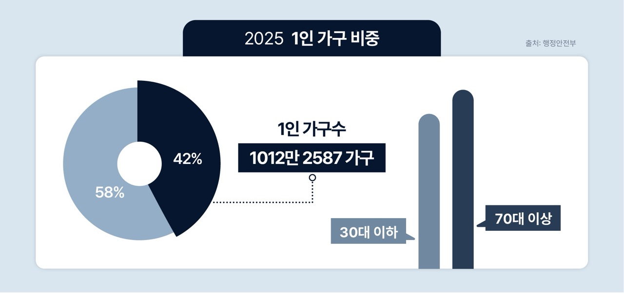 가족의 형태가 다양해지고 있다. 자녀가 없는 맞벌이 부부, 청년과 고령의 1인 가구, 자녀를 독립시킨 중장년 부부 등 소규모 가구가 빠르게 증가하고 있다. 실제로 행정안전부 ‘2025 행정안전통계연보’에 따르면, 전체 가구의 42%가 1인 가구이며, 70대 이상이 가장 높은 비중을 차지하고 30대 이하 청년층이 뒤를 잇는다.
