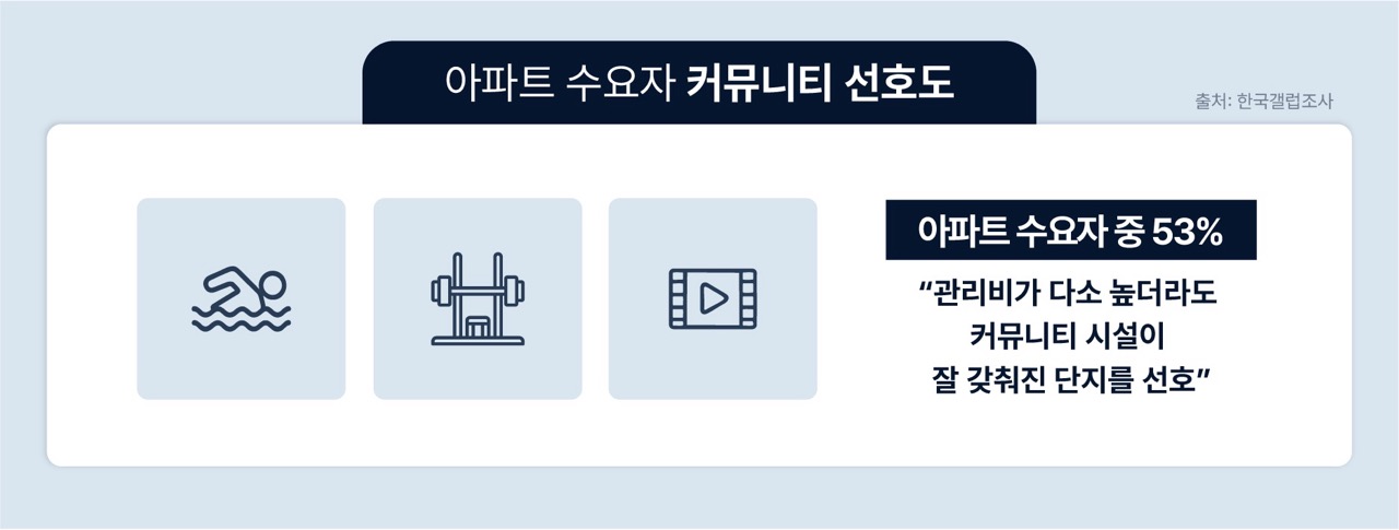 또한, 한국갤럽조사연구소의 2024년 조사에 따르면, 아파트 수요자 중 53%가 관리비가 다소 높더라도 커뮤니티 시설이 잘 갖춰진 단지를 선호한다고 응답했다. 이처럼 커뮤니티 인프라는 단지의 부가 요소를 넘어, 주거 선택에 영향을 미치는 핵심 요인으로 자리매김하고 있다.