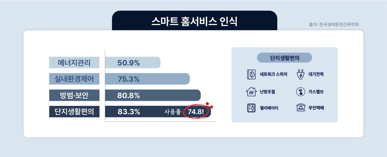 한국생태환경건축학회에서 발표한 스마트하우징 스마트 홈서비스 사용분석 보고서에 따르면, 스마트홈 서비스 중 ‘단지 생활 편의’ 기능을 가장 많이 인식(83.3%)하고 실제로 사용한 비율도 높았으며, 이어 ‘방범·보안’, ‘실내환경제어’, ‘에너지관리’ 기능의 인식률이 중요하게 나타났다.