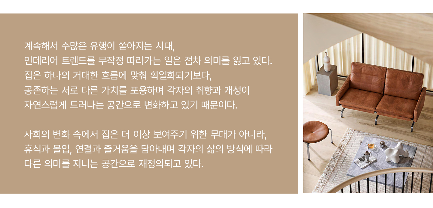 팬데믹 이후 집은 단순한 주거 공간을 넘어선 지 오래다. 글로벌 트렌드 예측 기관 WGSN는 2025~2027 라이프스타일 리포트에서 ‘Personal Sanctuaries(개인적 안식처)’를 핵심 키워드로 제시했고, IKEA의 글로벌 리포트는 혼자 있는 시간을 원하면서도 의미 있는 연결을 갈망한다고 분석했다. 개인의 시간을 보호하는 장소이면서 가족 혹은 사회로 연결되는 무대 역할을 동시에 수행해야 하는 과제에 직면한 것.