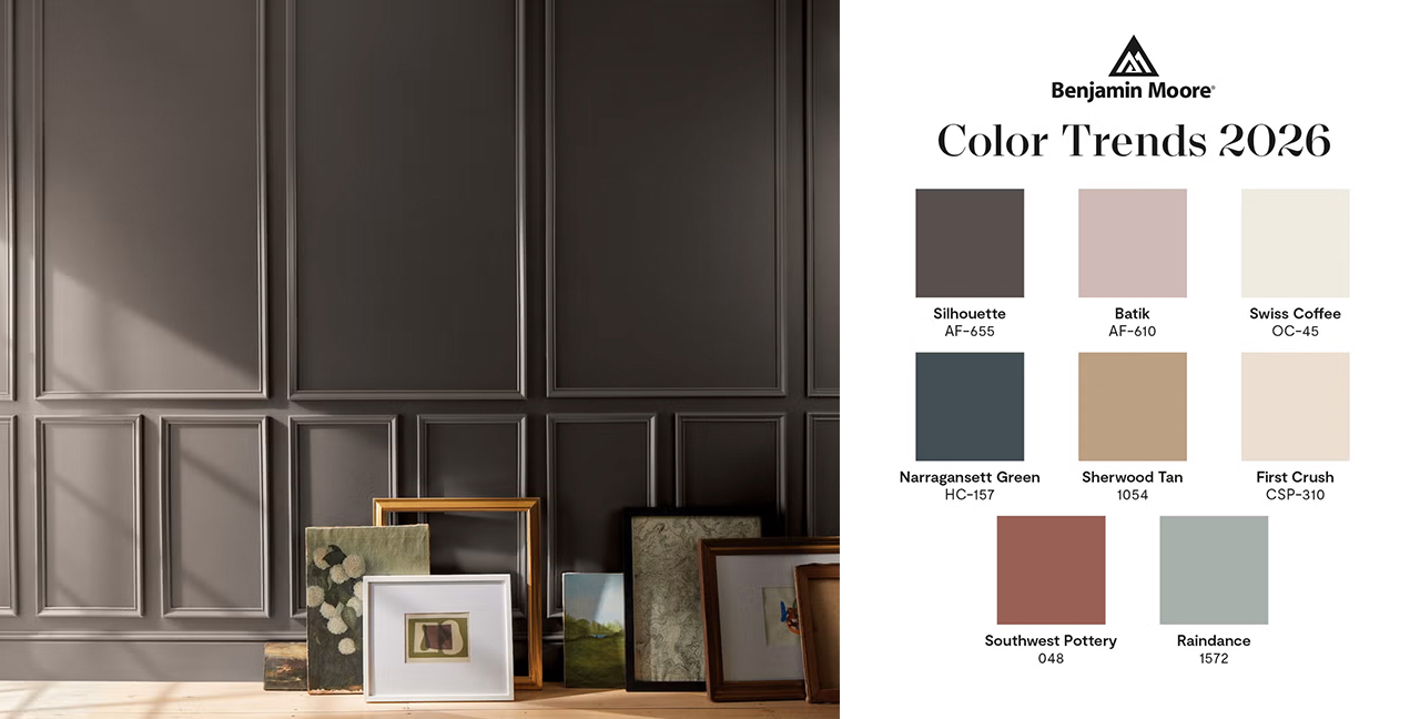 페인트 브랜드 벤자민무어는 올해의 컬러로 에스프레소와 차콜을 섞은 듯한 ‘실루엣’, 차분한 그린 ‘레인댄스’, 오프 화이트 ‘스위스 커피’와 테라코타를 닮은 ‘사우스 웨스트 포터리’ 등을 함께 제안하며, 모든 컬러가 단독으로도, 함께 레이어링해 사용하기도 조화롭다는 점을 강조했다.