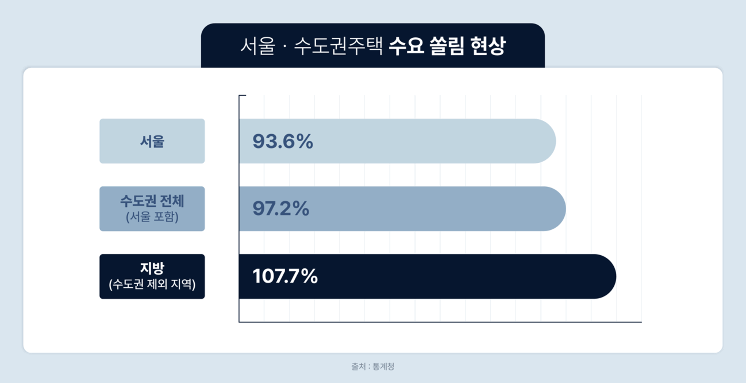 정부는 수도권의 주택 부족과 시장 불안을 동시에 해결하겠다는 강한 의지를 드러냈다. 지방의 주택 보급률은 107.7%로 비교적 여유가 있지만, 서울은 93.6%, 수도권은 97.2%에 머물러 공급 부족이 여전히 심각하다. 이를 해결하기 위해 향후 5년간 135만 가구를 착공한다는 계획을 내놨다.