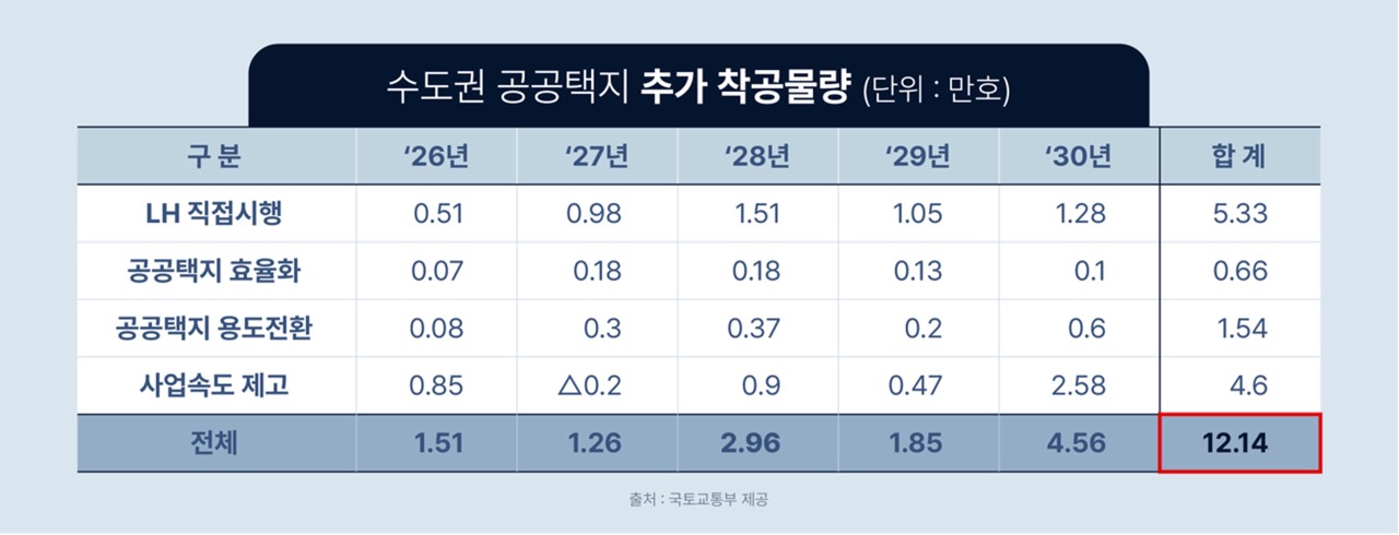 이외에도 기존 공공택지의 용도 전환, 개발 효율화, 사업 속도 제고 등을 통해 추가 물량이 확보된다. 이를 합산하면 2026년부터 2030년까지 공공택지에서만 12만 가구 이상이 추가로 공급될 전망이다. 세부적으로는 신규 공공택지 3만 호 검토, LH 소유 비주택용지 1만 5,000가구 전환, 사업 속도 제고를 통한 4만6000가구 확보 등 구체적인 수치가 제시됐다.