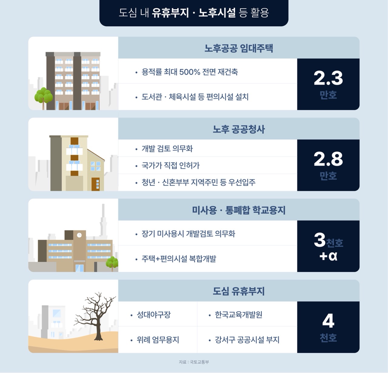 공공청사·학교 부지 같은 유휴 국공유지는 복합 개발을 통해 주택을 공급하며, 철도역사(창동역·원종역 등) 복합개발, 대학 유휴부지를 활용한 연합기숙사 공급도 추진된다. 폐교를 활용한 주거·교육·문화 거점 조성 방안까지 담긴 이러한 조치는 도심 내 다양한 유휴 공간을 활용해 주택을 확보하려는 시도로 볼 수 있다.