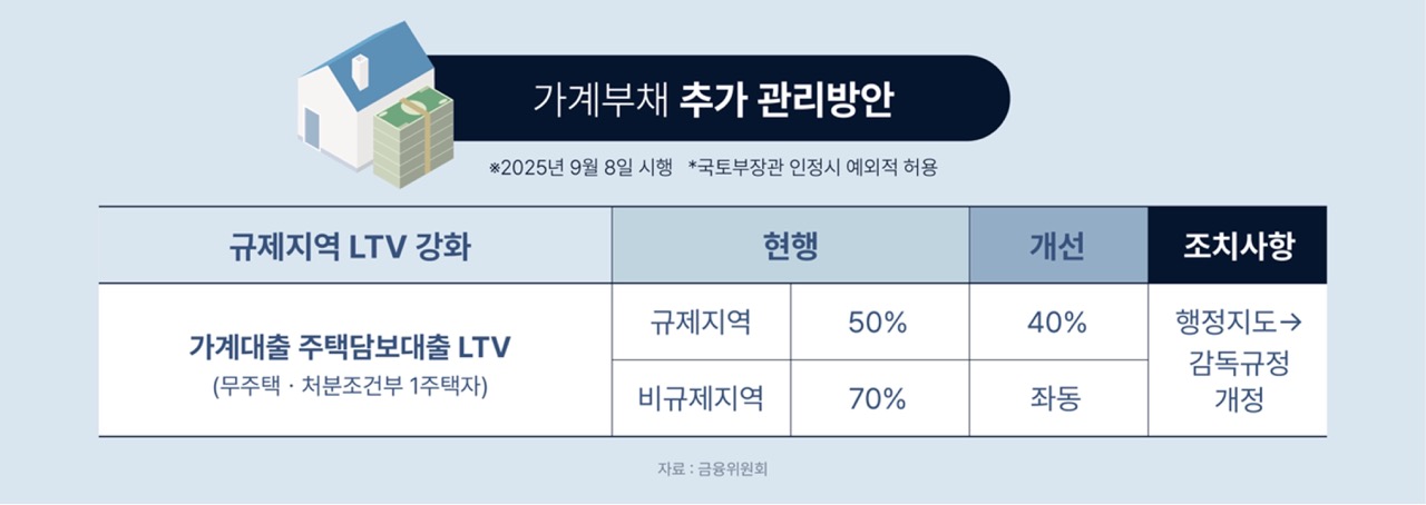 수요 억제를 위한 금융 규제도 강화됐다. 규제지역의 주택담보대출비율(LTV)은 기존 50%에서 40%로 낮아졌으며, 적용 대상 지역에는 강남, 서초, 송파, 용산 등이 포함된다. 비규제지역은 기존대로 70% 상한이 유지되지만, 수도권과 규제지역 내 주택매매·임대사업자의 LTV는 0%로 전면금지됐다. 또한 유주택자의 전세대출 한도는 2억 원으로 일원화됐다.