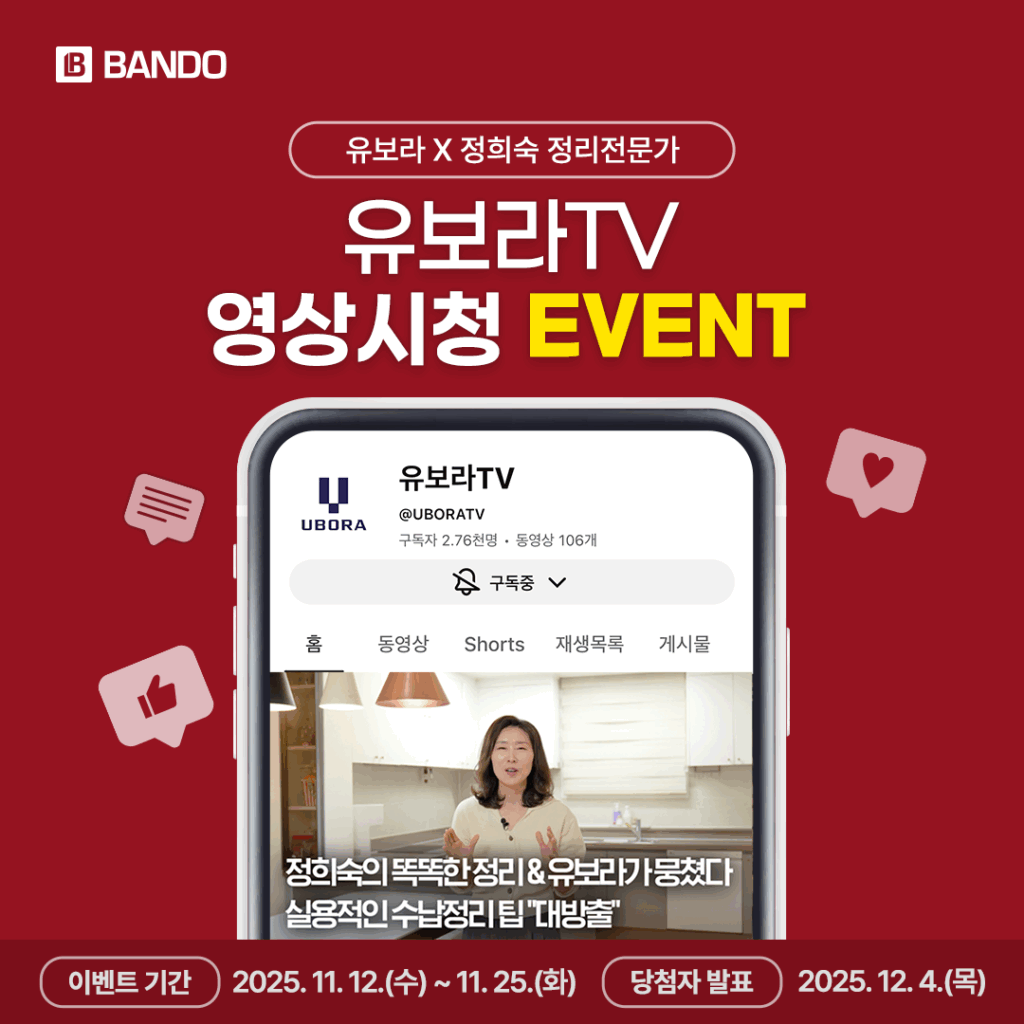 집은 늘어나는데, 수납은 부족하고… 어디서부터 정리를 시작해야 할지 막막했던 경험이 있는 유보라 입주민들을 위해 반도건설이 준비한 특별한 프로그램, ‘우리 집 수납 컨설팅’에 유보라 가족을 초대합니다. 이번 기회를 통해 수납 정리 전문 인플루언서 ‘똑똑한 정리 정희숙 대표’와 함께 우리 집 공간을 새롭게 재탄생시켜 보세요. 유보라 가족의 일상에 한층 더 여유와 만족을 더해집니다. […]