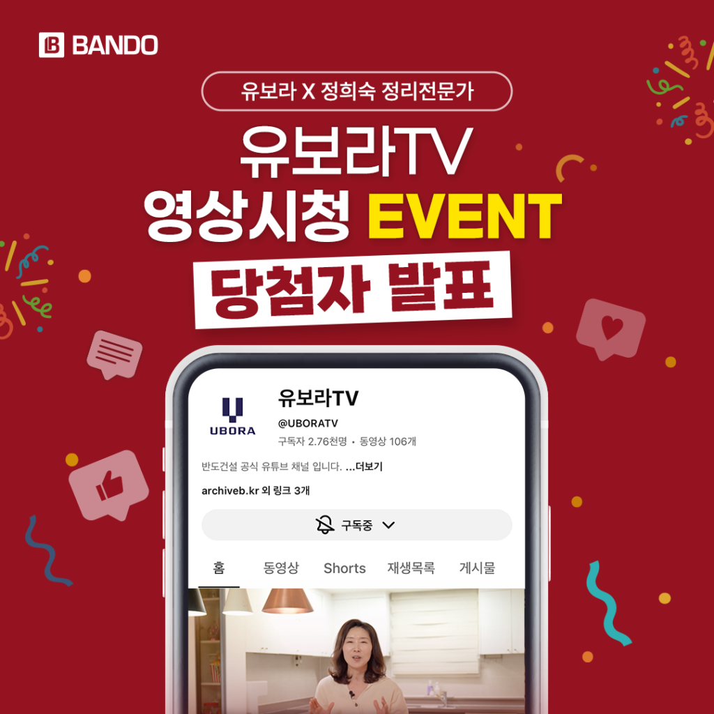 안녕하세요. 반도 웹진 ARCHIVE.B입니다. 지난 11월 12일부터 11월 25일까지 진행된 ‘유보라TV X 정희숙 정리전문가 영상 시청인증’ 이벤트에 많은 분들이 참여해 주셨습니다. 유보라 TV와 반도건설에 따스한 관심을 가지고 참여해 주신 분들께 다시 한번 감사드리며 1등, 2등, 3등의 당첨자 분들은 하단 당첨자 명단을 통해 확인 가능합니다. 이외 모든 당첨자 분들께는 응모 시 기재해주신 전화번호로 별도 문자 안내드릴 […]