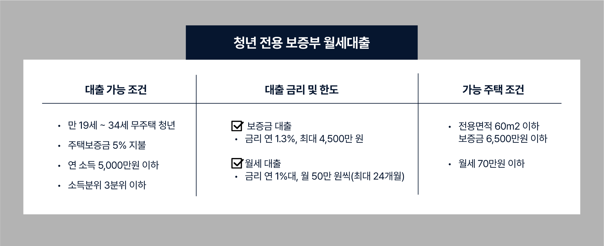 애초에 보증금이랑 월세를 낼 수 있는 돈이 부족한 청년들에게는 청년 전용 보증부 월세대출을 추천한다.
