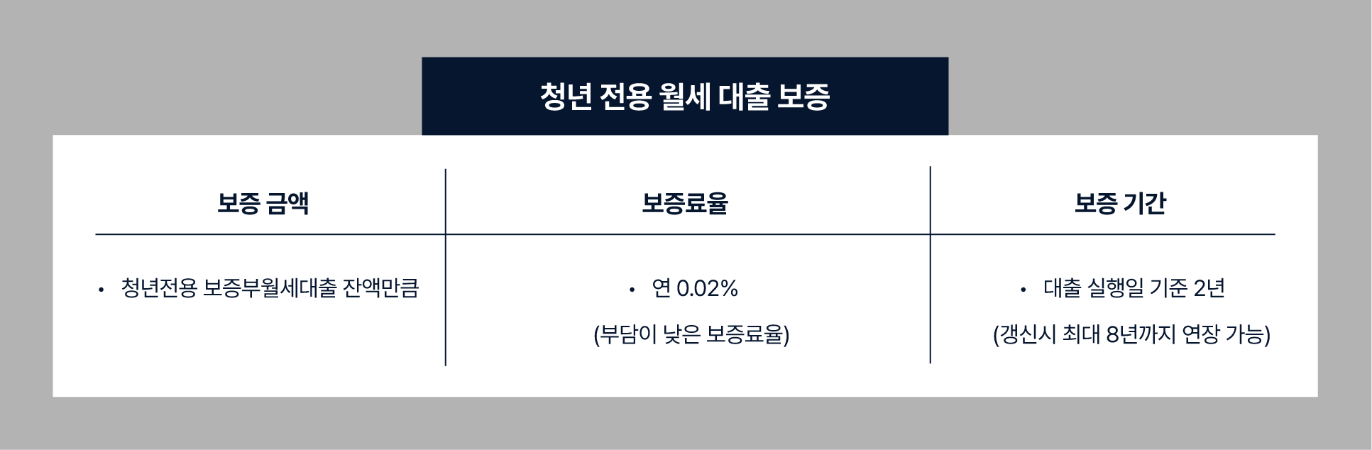 이와 함께 대출 보증부 월세대출을 이용한 청년 중에 만기 시 상환이 어려운 청년 대상으로 남은 대출금 보증을 서 주고 청년들이 당장 상환해야 하는 부담을 벌 수 있도록 도와주는 청년 전용 월세 대출 보증이 있다. 청년 전용 월세 보증부 대출을 이용한 청년이 집 계약이 끝난 뒤에 월세 대출금을 갚을 돈이 부족할 때 주택도시보증공사(HUG)가 대신 원리금 상환을 책임져 주는 제도이다.